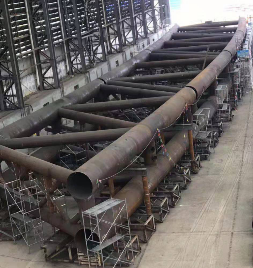 ? 犍為岷江特大橋是公司繼商合杭淮河特大橋、恩施找龍壩特大橋之后承建的又一座特大跨度鋼管混凝土拱橋,主跨457.6米,鋼結(jié)構(gòu)用工程量12000余噸。項(xiàng)目自開(kāi)工以來(lái)公司精心組織,克服了工期緊、任務(wù)重及焊接質(zhì)量要求高等困難,在成熟的施工經(jīng)驗(yàn)基礎(chǔ)上不斷改進(jìn)細(xì)節(jié)、提升設(shè)備能力、優(yōu)化資源配置、完善工藝方案,先后攻克了Q390D-Z25厚鋼板焊接、相貫線焊縫焊接及修磨、拱肋節(jié)段臥式拼裝工藝控制等技術(shù)難題,優(yōu)質(zhì)高效的完成了主拱肋首輪節(jié)段制造和試拼裝施工,為鋼管拱按期合龍奠定了堅(jiān)實(shí)的基礎(chǔ)。