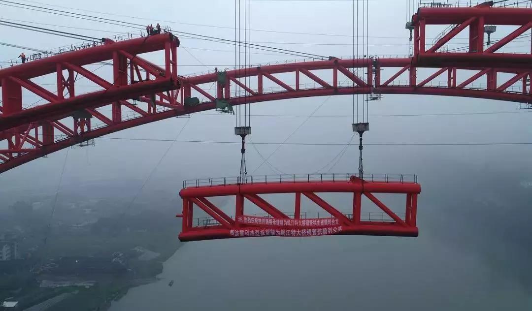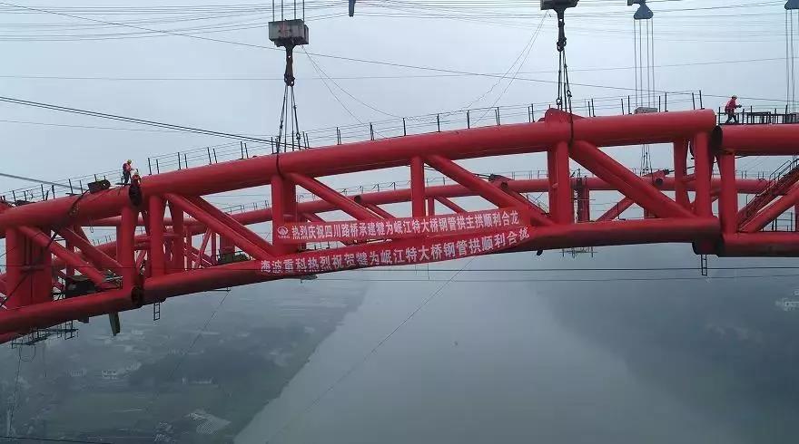 (海波重科新聞報(bào)道)2020年1月15日,犍為岷江特大橋施工現(xiàn)場,只見高高的吊塔聳立岷江兩岸,纜索吊裝系統(tǒng)已準(zhǔn)備就緒;江面上,運(yùn)輸船舶搭載著最后一段拱肋,將其運(yùn)送到指定位置。“開始吊裝!”伴隨著現(xiàn)場一聲指令,拱肋從江面緩緩升起。經(jīng)過1個(gè)多小時(shí)的吊裝,上午10時(shí)42分,由海波重科承接的犍為岷江特大橋主橋457.6m鋼管拱橋,完成最后一段拱肋吊裝,實(shí)現(xiàn)了拱圈高精度合龍,合龍精度3mm,合攏應(yīng)力和全橋線形均滿足設(shè)計(jì)規(guī)范要求。
