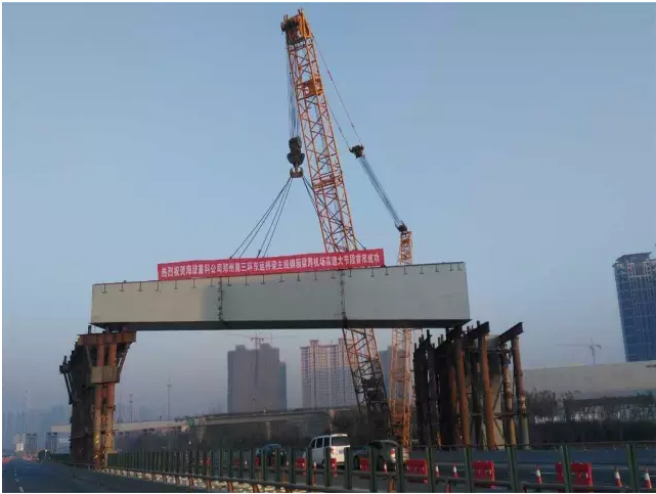 ? ? ? 昨晚,鄭州南三環(huán)二標跨機場高速主線橋鋼箱梁首節(jié)段歷時6小時順利吊裝就位,首吊節(jié)段長度32米,重量123噸,梁高3.8米,上跨機場高速,下穿高壓線吊裝,創(chuàng)下鄭州單節(jié)吊裝重量最大,長度最長,難度最高的鋼箱梁吊裝記錄,預(yù)計2016年12月31日可完成全橋鋼箱梁的安裝工作。